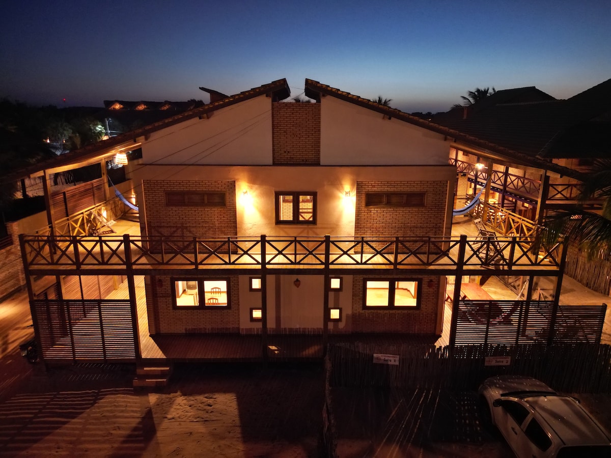 位於美麗的Barra Grande海灘上,距離著名且受歡迎的海灘酒吧「Trabalha Brasil」僅100公尺。 房子前面就有風箏。 白色沙子和棕櫚樹的海灣 只有整套房源出租。 1至最多6人 大廚房,住在樓下 上層有兩間套房,每間都有一張雙人牀和一張單人牀、一個巨大的陽臺和一個獨立衛浴。 兩個陽臺在房子外面彼此相連。