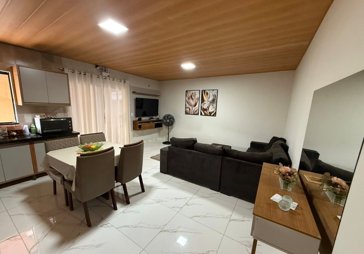 在這間安靜迷人的市中心住宿中放鬆身心。 配有新家具的新房子。 2間臥室,套房,配有空調和標準雙人牀、50英寸電視。 2號臥室配有單人牀和空調。 房間配有空調、65英寸電視。 設備精良的廚房,備有 3-Corazões 咖啡機、濾水壺、微波爐、三明治機、攪拌機等。 有洗衣機。 Wi-Fi、電動柵欄、電子門、對講機。 床單、毛巾、肥皂。