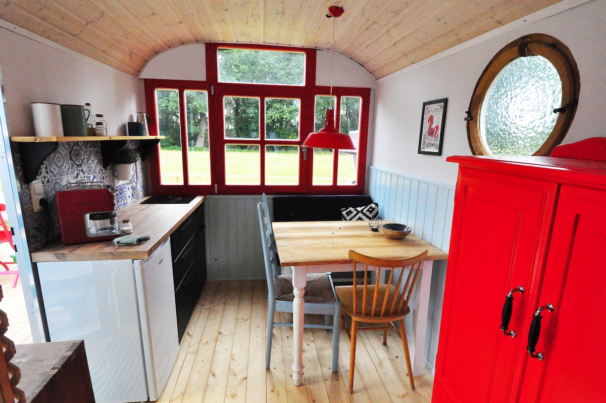 歡迎來到 10 平方公尺的「全方位舒適」空間。 我們精心佈置的建築車「Helga Luise」坐落在蘋果草地上,可俯瞰小馬和更多草地。它有一個很棒的露臺,配有桌子、椅子、舒適的海灘籃椅和令人驚嘆的景觀。 內部有一張 1.4 公尺 X 2 公尺的大床、一張雙層床(0.7 公尺 X 1.4 公尺)可供兩個孩子使用、休息區、衣櫃和一個配有冰箱和電磁爐的廚房。