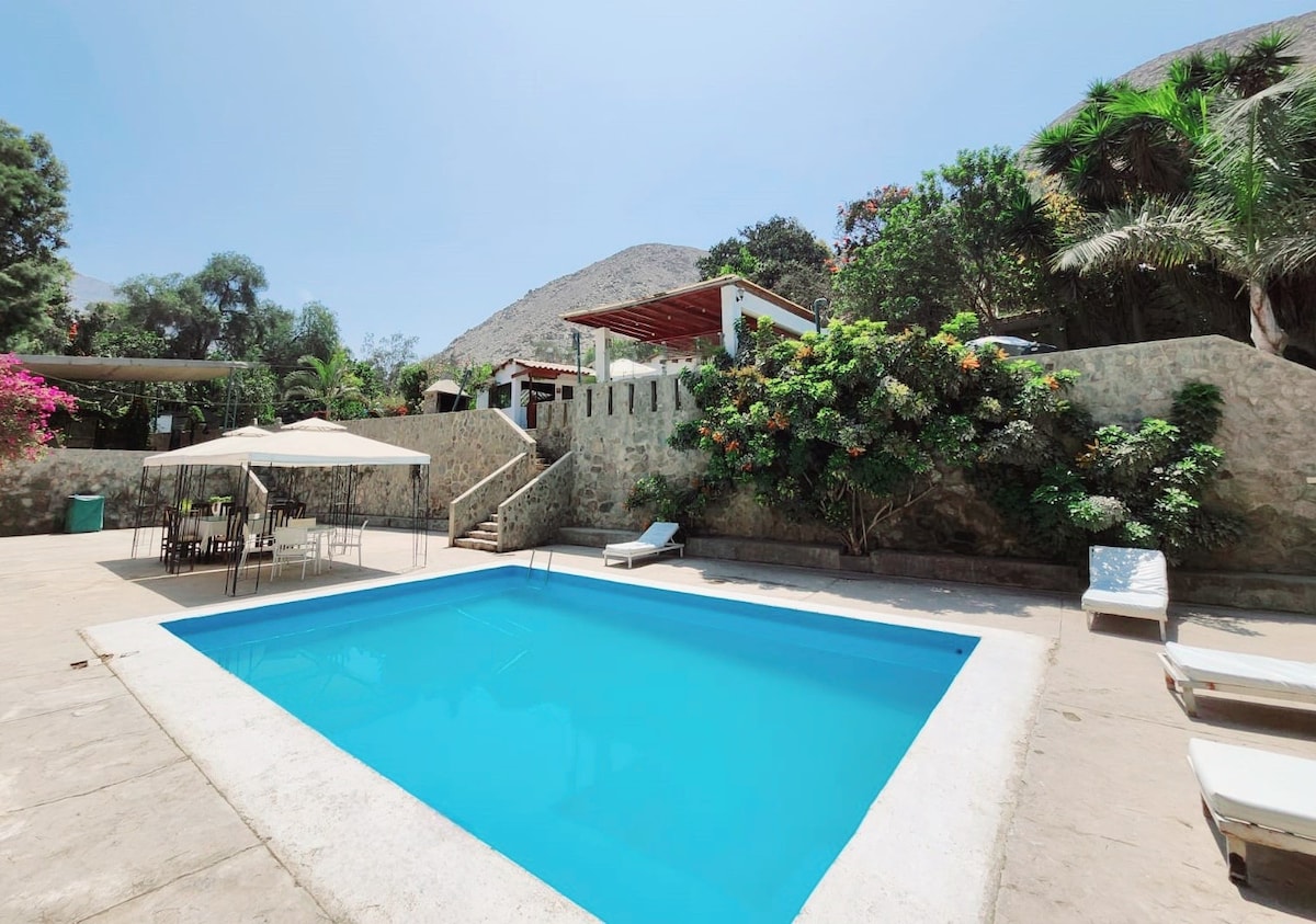 入住:上午 9 點(彈性) 退房時間:上午 11 點 可容納 8 人的私人鄉村別墅。 全年陽光充足!! 游泳池、花園、壁爐、果樹區、烤肉區(烤架、中國盒子、木材廚房、泥爐)、營火和兩個停車位。 設備齊全的廚房、WiFi/有線電視、2 臺電視。 地理位置優越,與盧林河 (Rio Lurin) 平行。