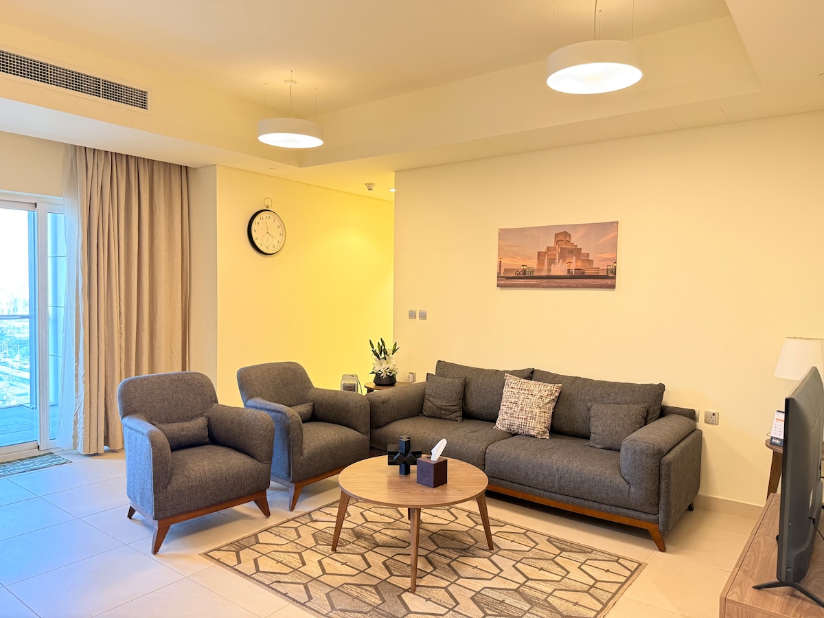 歡迎來到À La Maison! 西灣泻湖Zigzag Tower B的時尚舒適2BR ,配備智慧功能、自然光線和海景和城市景觀。 享受明亮的客廳,配有智慧電視和棋盤遊戲、酒吧高度的餐桌、雙人床和雙人床,以及設備齊全的廚房。 位於Zig Zag Tower B,靠近Lusail、Katara和Lagoona Mall。