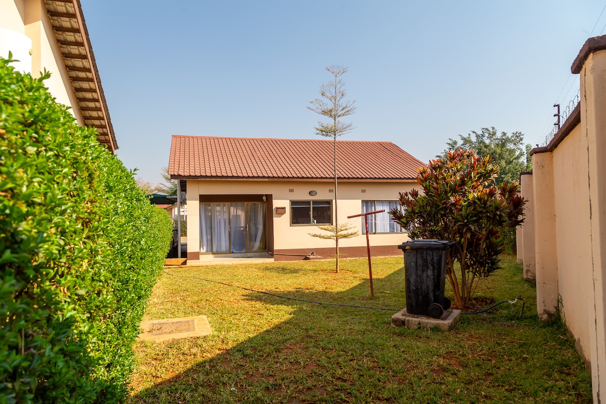 Peaceful, centrally-located. Cosy bed-sitter in yard with main house, queen-size bed, sleeper couch, closet and air-conditioned. Shower, toilet, kitchen space with fridge, microwave, gas-stove. Working table/dining table and a TV with WIFI. Swimming pool and shed with outside chairs available. Beautiful environment with trees and flowers. Cleaning services available. Laundry and ironing services at a cost. Electricity backup available with solar. Wi-Fi available when loadshedding is on.