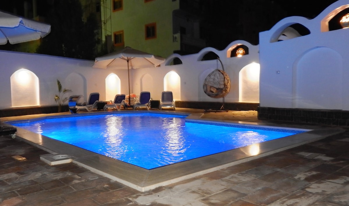 在這片寧靜優雅的綠洲中放鬆身心。 沙漠玫瑰別墅(Villa Desert Rose)地理位置優越,為房客提供最舒適的住宿體驗,讓您度過難忘的假期。 別墅四周環繞著大自然,設有寬敞的游泳池,由三間公寓組成:奈費爾提蒂、奧西里斯和套房時段,均可在Airbnb上預訂。 我們會為您提供豐富的早餐(包含在價格中)和迎賓茶。 房價包含接駁車服務。