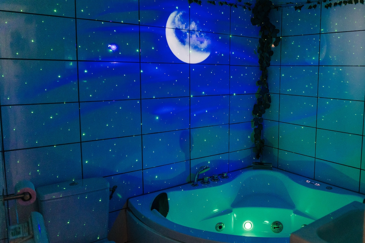 Plongez dans l’univers d’Avatar ✨. Studio immersif avec jungle suspendue, lumières tamisées et déco unique 🌿. Profitez du lit sous la canopée avec TV 55’’ 📺, d’une baignoire balnéo privative avec jets hydromassants 💦 et d’une table de massage pour un moment détente 💆. Séjour cocooning idéal pour un instant romantique ou relaxant, avec cuisine équipée et accès à pied aux commerces et restaurants du centre-ville 🍴.