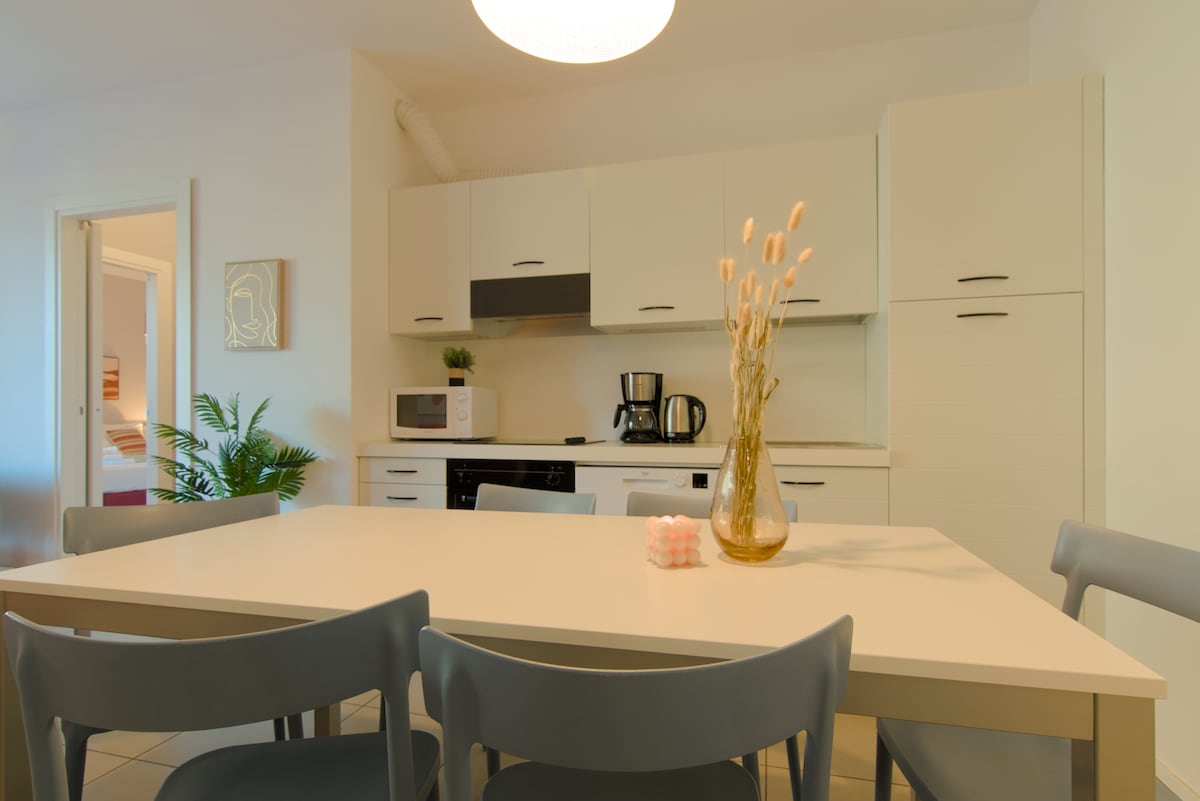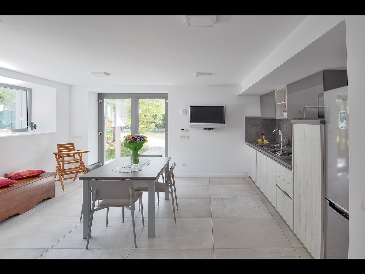 新公寓,位於距離湖泊150英裏的住宅區,靠近最好的餐廳和披薩店。 位於現代化別墅的一樓,直接在花園上,包括一間配有洗碗機廚房的起居室、配有加大雙人牀的雙人臥室、雙人臥室和大浴室。 獨立入口,靠近停車場,大型維護良好的花園僅供房客使用,有蓋露臺可供午餐使用。 公寓有免費空調和Wi-Fi。