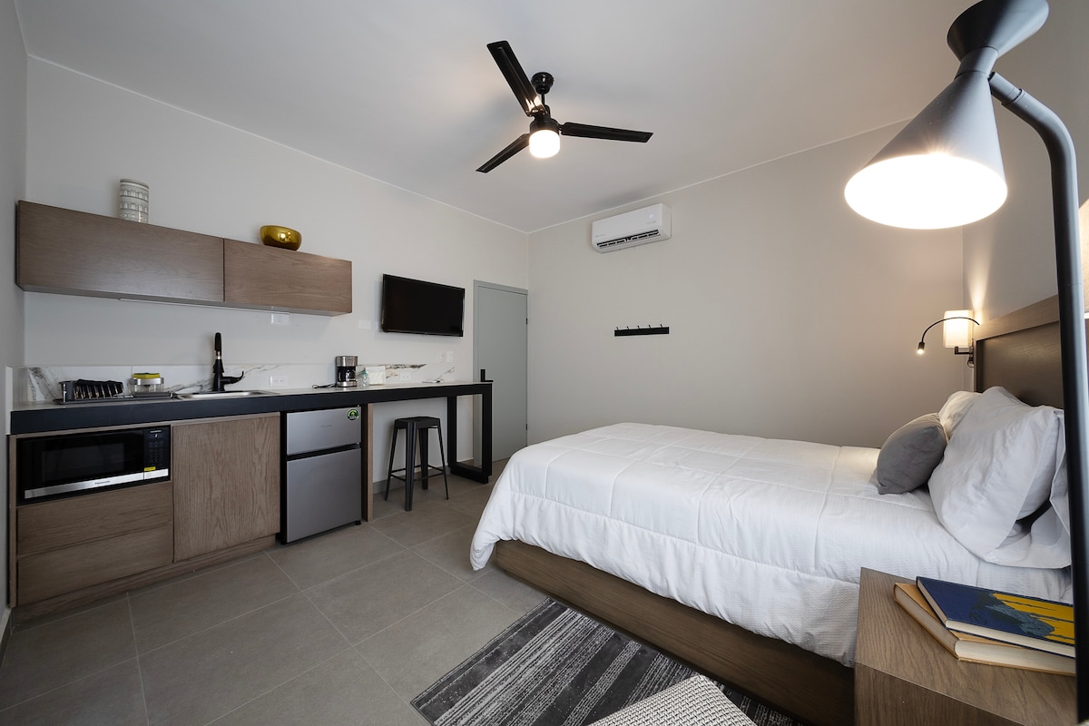 位於蒙特雷市中心的寬敞、現代化和設備齊全的閣樓。 🍽️ ☕️ -廚房配有平底鍋、鍋具、空氣炸鍋、咖啡機(美式咖啡、低咖啡因咖啡和茶)、廚具等。 🛏️ - 標準雙人床、乾淨的床單和床上用品 🛋️ -舒適的沙發床 ❄️迷你分離式空調和暖氣 📺 - 50英寸電視、Netflix、Prime、HBO Max 🛁 -全套浴室、乾淨毛巾、烘乾機和洗漱用品 👨💻 -書桌 + Alexa 🏪 - OXXO 🏋️♂️多項設備與服務
