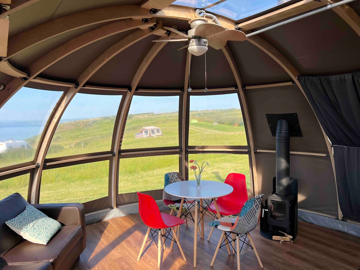 在Stargazer Domes醒來,欣賞海景和整個卡迪根灣。New Quay地理位置優越,可充分利用迷人的景色,步行15分鐘即可抵達海岸小徑。每個帳篷都有木製熱水浴缸、燃木爐和自己的私人馬桶和淋浴間。加大雙人床可供2位成人入住,並有雙層床,非常適合兒童入住。