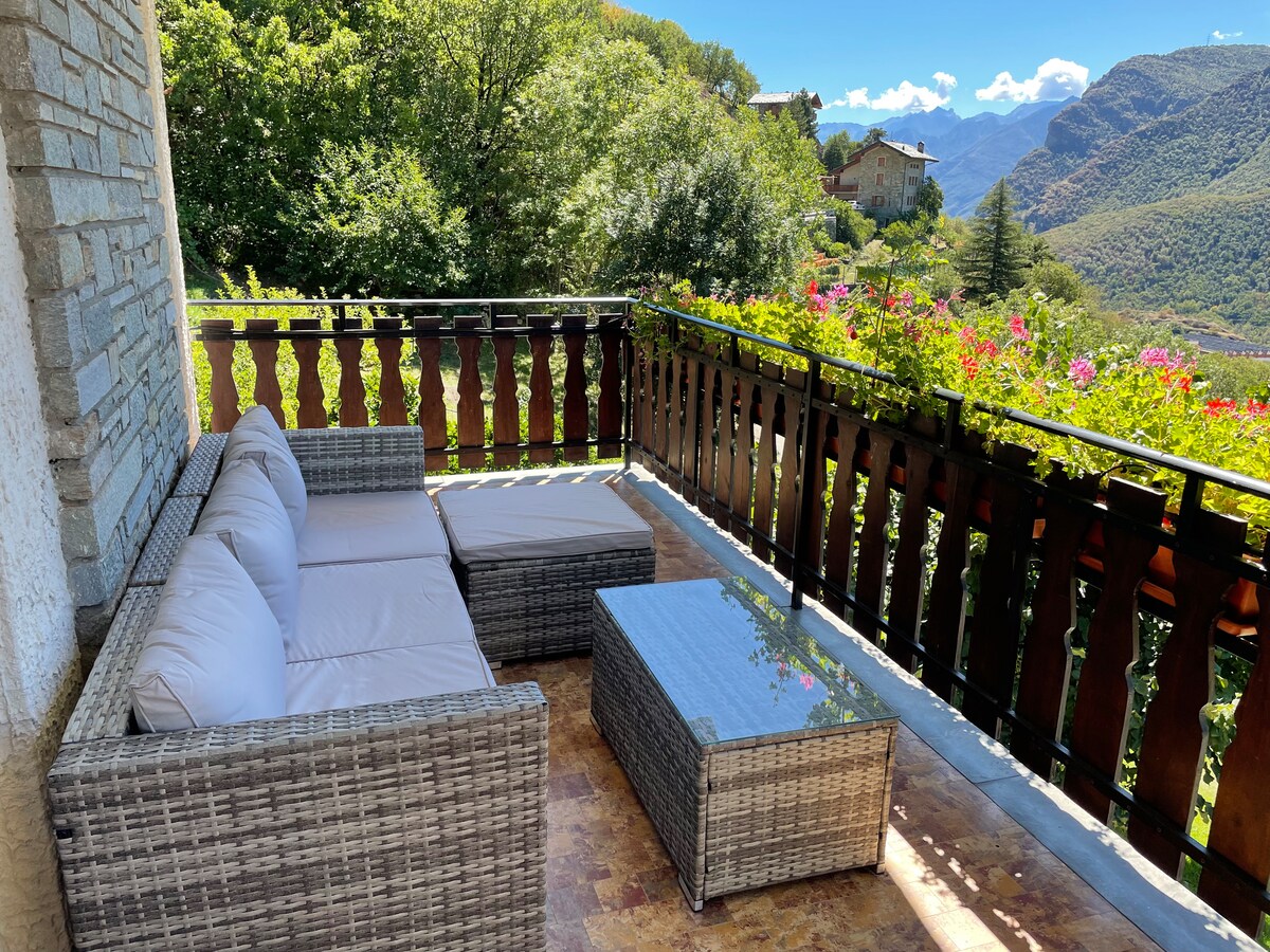 Rascard luminoso indipendente a due piani con vista sulla valle, balcone privato e ampio terrazzo condiviso e attrezzato. La casa dispone di una grande camera matrimoniale con annesso terrazzo, un soppalco con due posti letto con vista panoramica, in più comodissimo divanoletto da 2 posti. Wi-Fi di fibra ottica. Cucina attrezzata con qualità. Smart TV HD Sony. Camino e stufa, radiatori elettrici in bagno e camera dal letto. Posizione super comodo per servizi, escursioni e sci.
