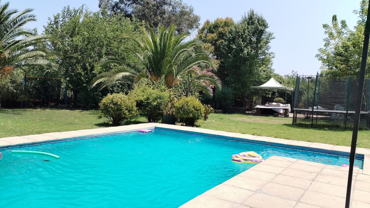 在這個寬敞而寧靜的空間中,遠離您的煩惱。 您可以享受綠地,這是一個舒適、設備齊全且有空調的地方。 此外,您還可以使用專屬於租用此處的人的陶罐。 附近有許多吸引人的地方,如蒙蒂塞洛賭場、葡萄園(例如聖麗塔)、戶外活動(La vacada、Cantillana)和博物館。 距離聖地牙哥 40 分鐘,距離蘭卡瓜 35 分鐘