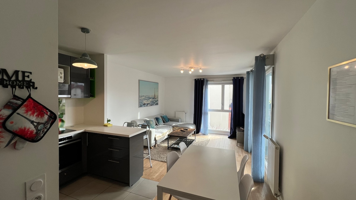 43 平方公尺,2021 年 6 月翻新,明亮,可容納 4 人。我優先考慮房源的乾淨度。一間大客廳,配有沙發床、一間功能齊全的廚房(烤箱、電磁爐、微波爐、冰箱)、一間配有雙人床的臥室、一間配有廁所的浴室、WiFi。提供床單。公共交通非常便利(58 和 59 路巴士、地鐵 13 號線、火車、電車),可參觀巴黎或前往展覽中心(步行!)。 非常適合參加凡爾賽門沙龍 (Salon porte de Versailles) 的參展商。