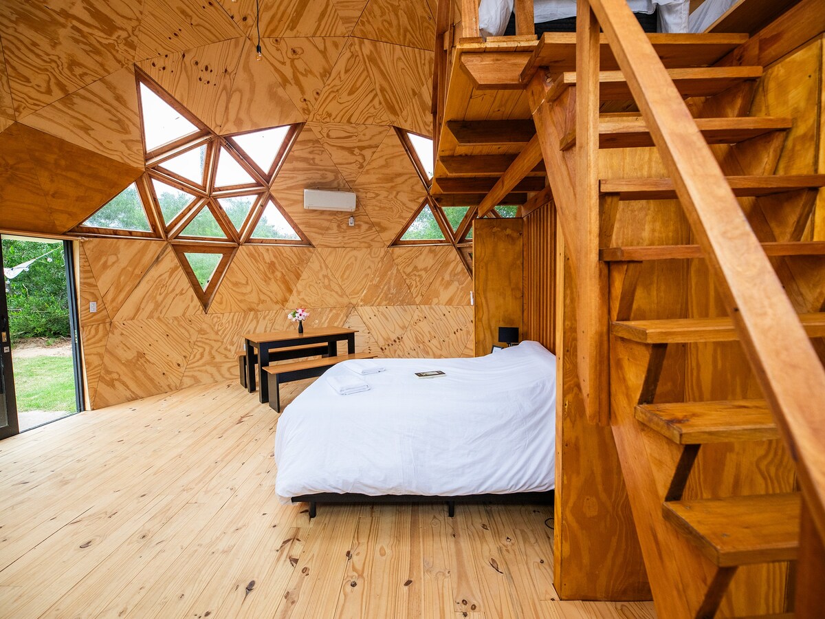 Para quienes buscan de la vida al aire libre, el domo cuenta con un deck de madera con hamacas y sillones, ideal para relajarse bajo el sol o disfrutar de las noches estrelladas junto al fogón. Ubicado a 500 metros de una de las mejores playas de la zona. El interior está totalmente equipado, podrás cocinarte como si estuvieses en tu casa. La ropa de cama y de baño está incluida.
