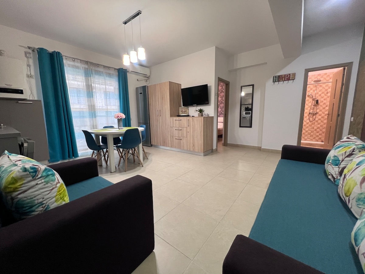 這間公寓是一個寧靜的地方,即使它位於康斯坦察市中心,靠近Fantasio劇院,也能讓您好好休息。這間2房公寓非常乾淨,提供舒適的氛圍,配有高雅的細節、帶用餐區的大臥室、帶大電視的舒適客廳、空調、漂亮的陽台、設備齊全的廚房和浴室。此房源適合2人入住,但也可以容納額外1人睡在沙發。沙發不可伸縮