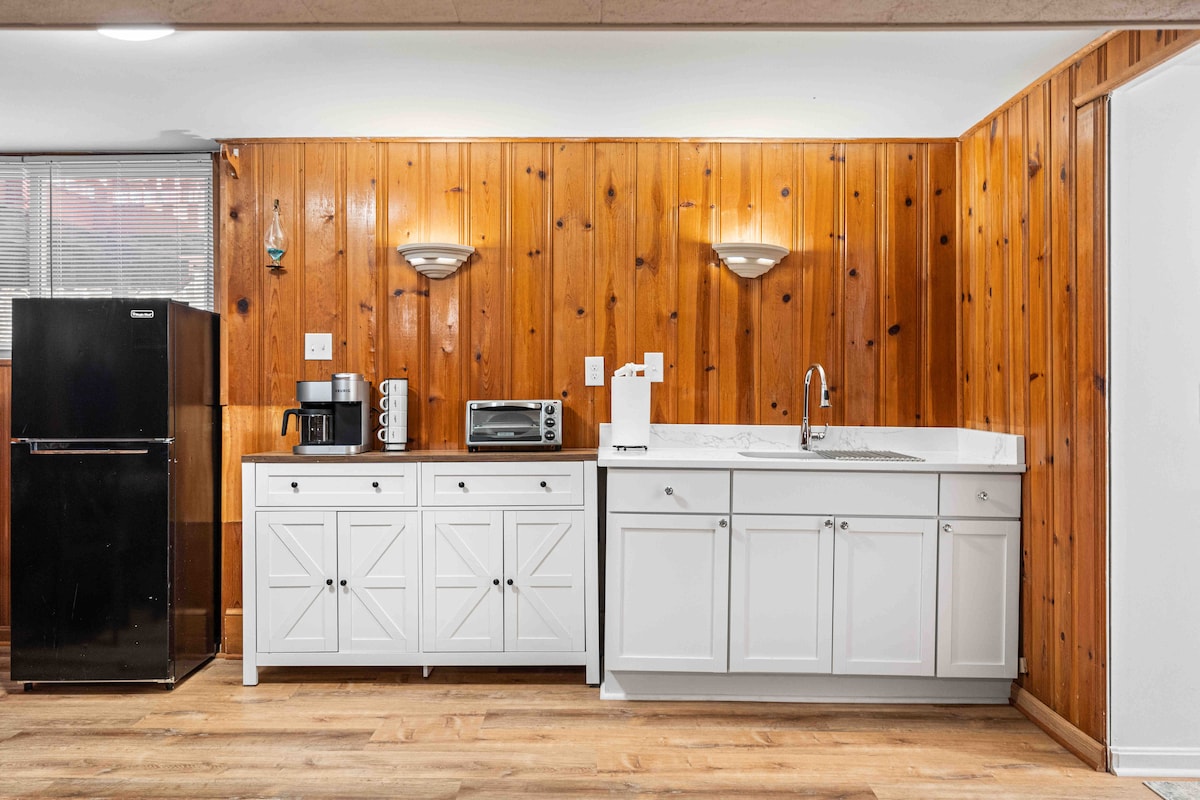 可愛的1200平方英尺地下室套房,配有私人後門,包括迷人的臥室、全套浴室、酒吧和冰箱/冰櫃、3張床( 1張雙人床、1張全尺寸沙發床、1張日式床墊)、共用洗衣房/烘乾機、共用露臺/後院。安全的郊區位置,靠近購物區和GMU。 大型平面智慧電視,可收看串流頻道和訂閱服務。1輛車的免費停車位。 共用後院,可欣賞放鬆的林木景觀(部分圍欄)。 寵物友善!