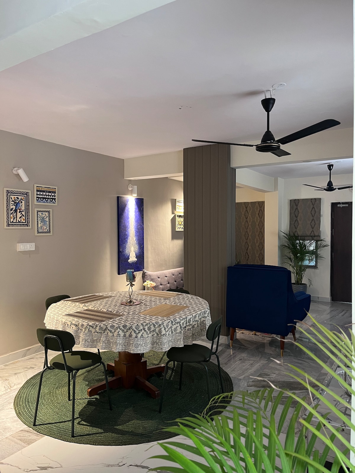 Our apartment is airy, aesthetic, and spacious. You will enjoy a huge living/dining room, 2 bedrooms, 2 bathrooms, a fully functional kitchen, and a balcony with views over the city skyline, opening up to Chamundi hills. On our terrace, you can practice yoga, or make yourself a cup of tea and get ready to watch the most beautiful sunsets. We are fully equipped to accommodate remote workers, long-term guests, families, and corporate travellers, with all the amenities for a comfortable stay.
