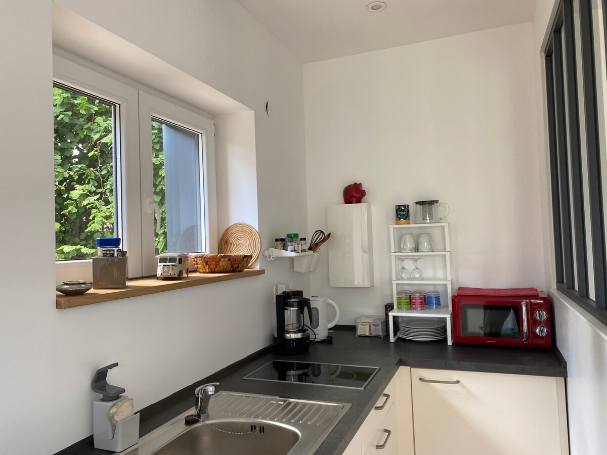 安靜、翻新、設備齊全的F2公寓,位於獨立住宅的一樓,靠近南錫。 這套明亮安靜的住宿非常適合放鬆或專業入住。 它包括: -一間大客廳,配有沙發床、電視、設備齊全的現代化廚房、可容納4人的酒吧 -一張完美的辦公桌,適合遠距工作,一張沙發床 -舒適的臥室,配有高品質的雙人床160x200、電視 -一間現代化且功能齊全的浴室,配有馬桶