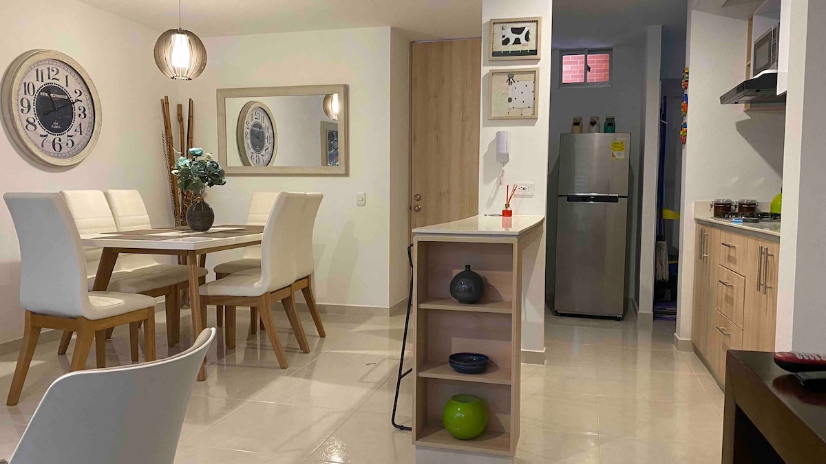 Apartamento cómodo ubicado en la milla de oro de Ibagué, zona exclusiva a solo 100 mts de los mejores centros comerciales de la ciudad, en barrio tranquilo y con un parque enfrente. Es un alojamiento pet friendly, cuenta con ducha de agua caliente, cocina integral equipada con todos los utensilios y electrodomésticos, servicio de Wi-Fi, habitaciones muy cómodas que cuentan con closet, disponibilidad de sofá cama y servicio de televisión con plataforma de magics. Es un alojamiento ideal