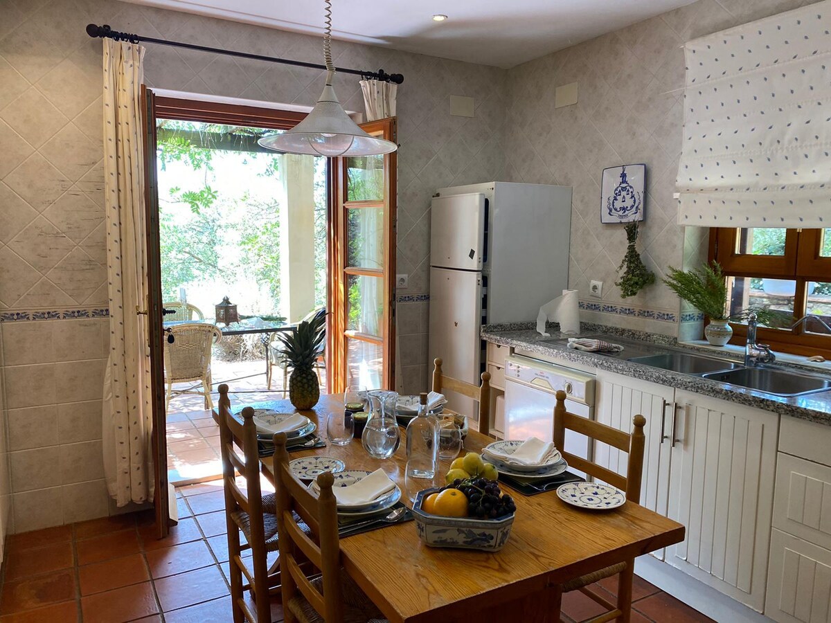 Beautiful country house away from the noise of the city. It is wonderful to spend summer evenings on any of its porches, in the large pool area or under the shade of its trees. Insertable fireplace with wood oven and heating. It is a house designed for life in nature. Fruit trees and chicken coop. that you can eat . 20 minutes from Seville by motorway. Exterior lighting. Privacy. All-terrain vehicle recommended but not always. Ask please
