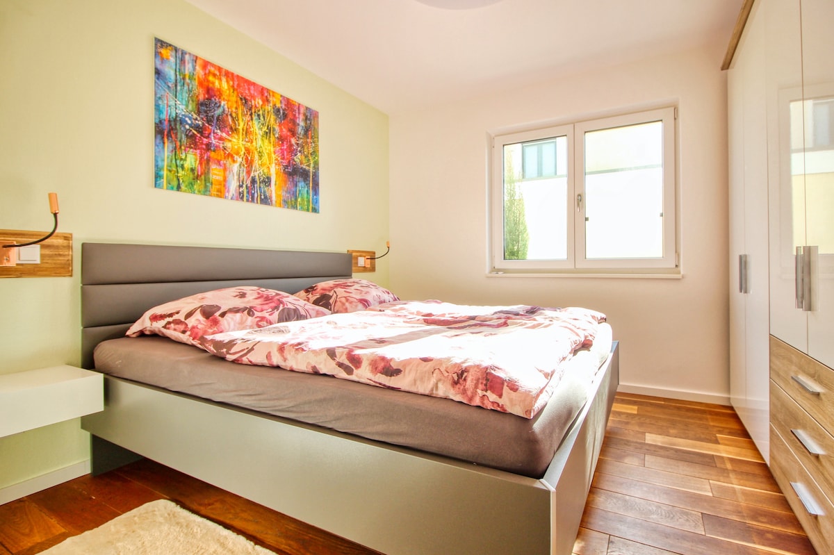 兩層公寓(約30平方米)位於一棟新裝修的雙戶住宅的頂樓(樓梯在地面上),安靜,靠近城市/自然,山坡上的全景位置,黑森林景觀,鑰匙盒,有效且安靜的空調,10平方米花園,老城區(1.8公里),開車:5分鐘,自行車或 巴士(距離車站 300 公尺)5-10 分鐘,步行 25 分鐘。乘坐巴士前往火車站:25分鐘。免費:2輛簡單的自行車(請求)、停車在 街道、Wi-Fi、床單、浴巾/毛巾。300公尺外:商店、咖啡廳、餐廳。