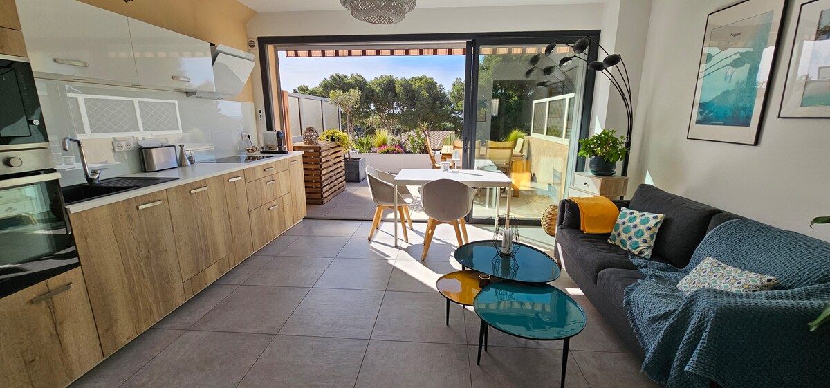 在這間 24 公尺的全新單間公寓中放鬆身心,享受海景和港口景觀的露臺,並有私人停車位。 配備齊全的廚房、冷暖兩用空調、沙發床、毛巾和床單、迎賓套件。 非常適合情侶入住(提供嬰兒床)。 夏季可使用泳池。 步行 5 分鐘即可抵達海灘和港口! 您可以在整個藍色海岸 Carry、Ensues、Niollon 海灣享受美麗的遠足和散步... 提供 WiFi 和 Netflix。