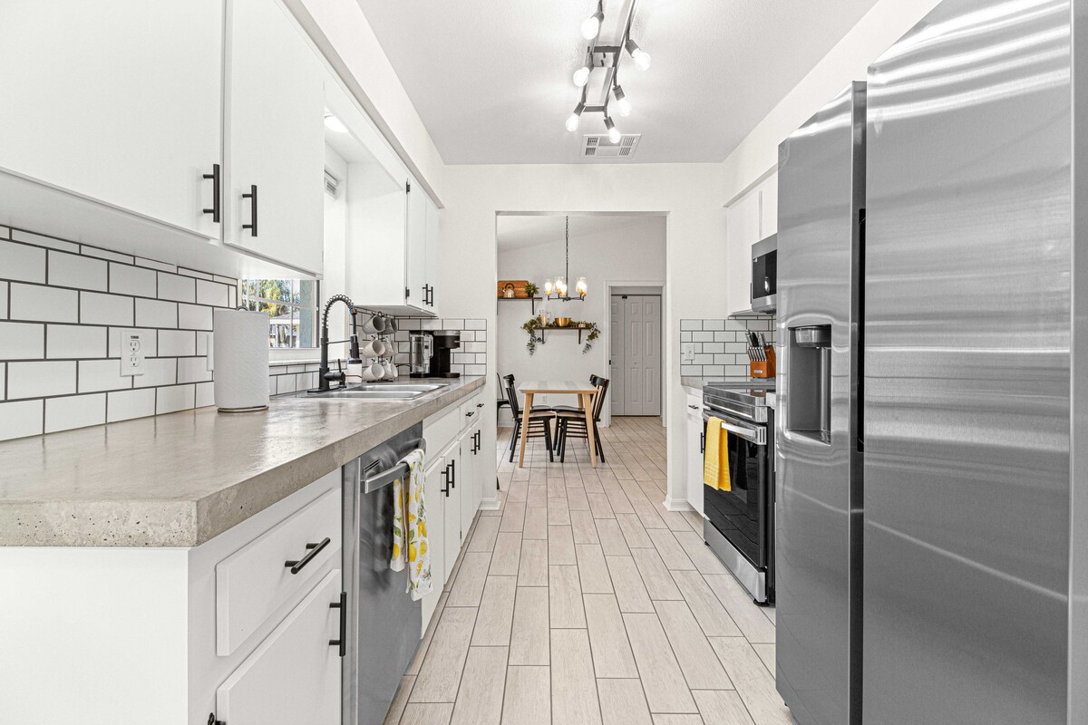 2 間臥室 2 間浴室房源,車庫內有遊戲室(和洗衣房)。此房源位於安靜的街區,車道上有2輛車的停車位。 -步行即可抵達橫跨佛羅里達州的綠道(就在奧卡拉綠道飛盤高爾夫球場旁邊) -10 分鐘即可抵達銀泉州立公園 -15 分鐘到 Santos Trailhead -20 分鐘即可抵達奧卡拉市中心 -25分鐘即可抵達佛羅里達馬公園 -35分鐘到世界馬術中心(18英里) *所有時間均為估計時間,因為交通狀況會有所不同*