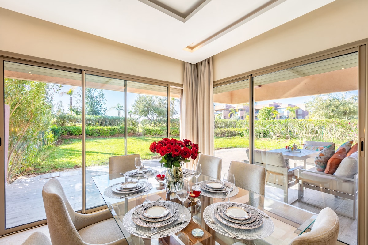 Au cœur de Marrakech, venez profiter de ce superbe appartement, entièrement rénové et décoré avec goût. Entièrement équipé, literie neuve et de qualité, l'appartement dispose de tout le confort et le luxe nécessaires à un séjour reposant en famille ou entre amis. La résidence possède au-delà de son golf, de nombreuses piscines, restaurants et espaces verts. L'appartement est situé à Prestigia golf de Marrakech, qui se trouve à moins de 10 minutes de l'aéroport, 5 minutes de la médina.