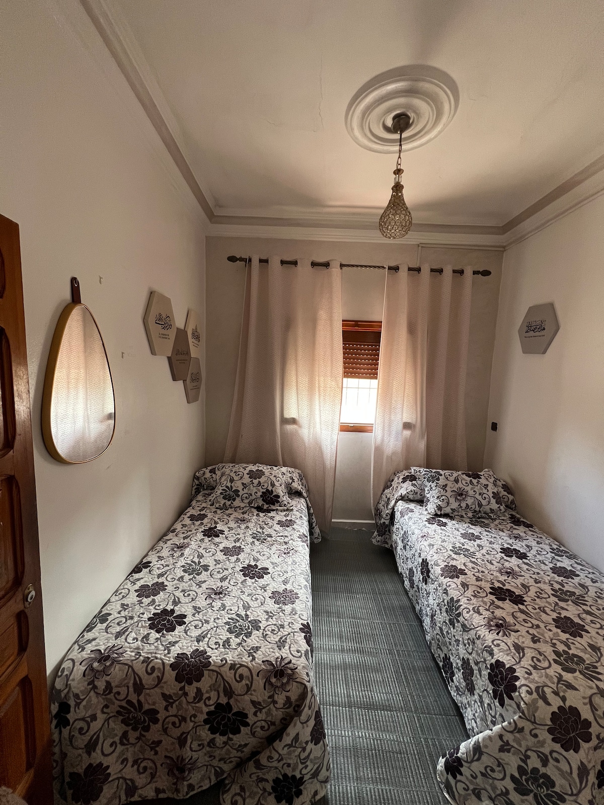 靠近通往麥地那主要門戶之一的漂亮里亞德。 寬敞的房子,有一個大露臺。街道層有入口、廚房、浴室、客廳、餐廳和小客廳。一樓有雙人房,配有單人床、盥洗室和三人房,配有雙人床和單人床。二樓有一個大露臺,可俯瞰老城區和山脈。 麥地那門旁邊有免費的停車場。 如果可以,我們將隨時接待您,請向我們詢問
