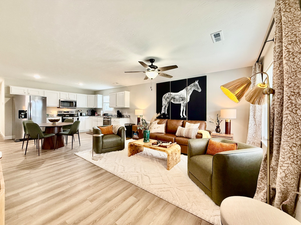 3間臥室、全新淋浴間、毛巾、床上用品、枕頭頂部床罩、4臺電視(Roku智慧電視)、WiFi、用餐廚房、鍋子、平底鍋、碗盤、餐具、冰箱、爐子、微波爐、Keurig風格咖啡機、烤麵包機、攪拌機、熨斗、熨衣板、洗衣機和烘乾機。 有圍欄的後院和火坑。 靠近威爾明頓學院,開車前往ABX Air需10分鐘,前往羅伯茨競技場和會議中心需15分鐘,前往世界馬術中心需10至15分鐘。開車前往科萬湖需17分鐘。前往凱撒溪需25分鐘。前往KI需39分鐘。