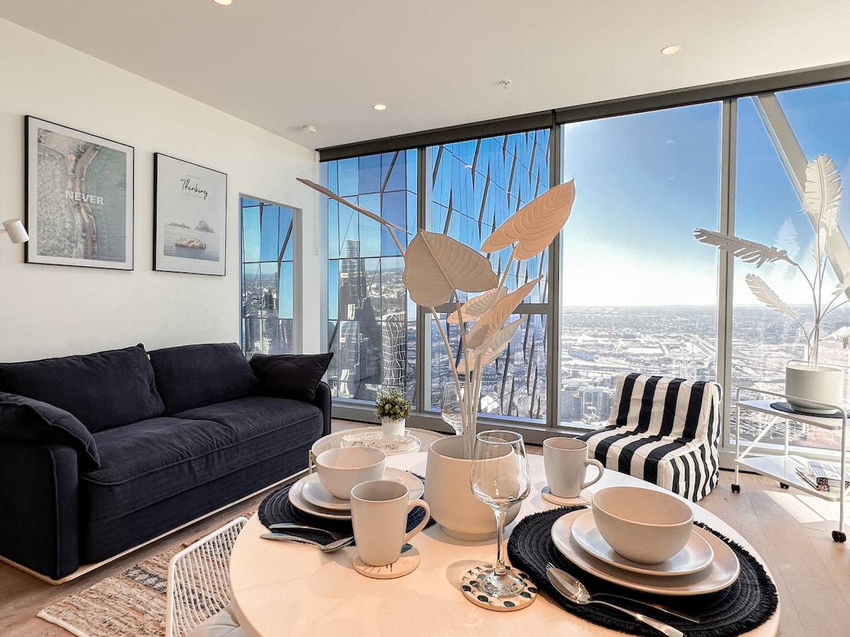 位於CBD中心的45樓的大型1B1B公寓,豪華裝飾,配有冬季花園,令人驚嘆的城市河景,尤其是高樓層的夜景。漂亮舒適的住宿,靠近墨爾本中央車站、維多利亞市場、超市、電車、餐廳、咖啡廳等。各式各樣的高級餐廳和飯店。購物早午餐和娛樂都有提供。免費高速 WiFi。Netflix電視。充分利用健身房、泳池等設備。