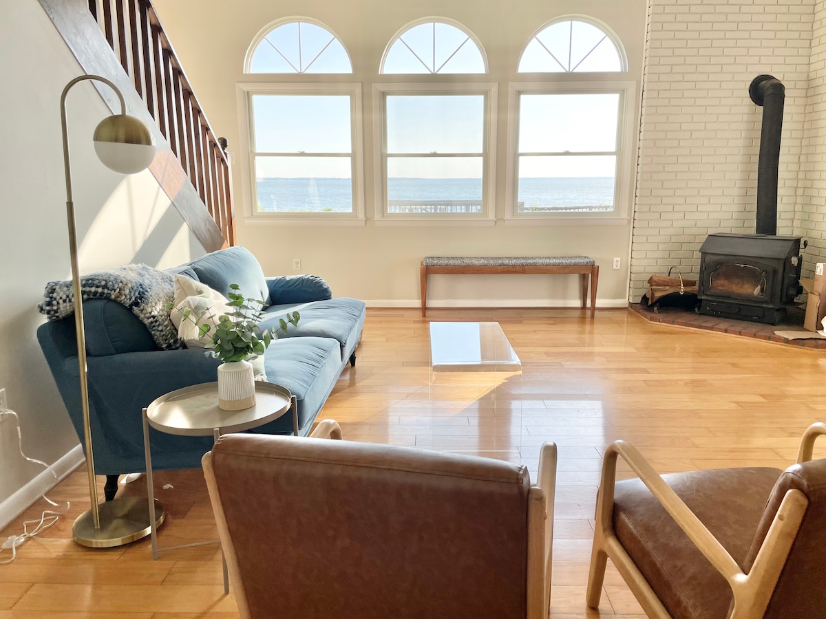 位於Cobb Island的4間臥室海濱房源+家庭健身房,每扇窗戶都能欣賞水景! 四輛海灘巡洋艦自行車和私人碼頭,配有4艘皮艇,可享受寧靜的Neale Sound。廚房外的按摩浴池+私人露台。房子內有窗戶牆,自然陽光充足。島上聲音和河邊的景色。3 間大臥室(2 張加大雙人床/1 張標準雙人床),有自己的浴室(1 間臥室在 1 樓,無樓梯)。3間臥室配有智慧電視。很棒的娛樂空間!