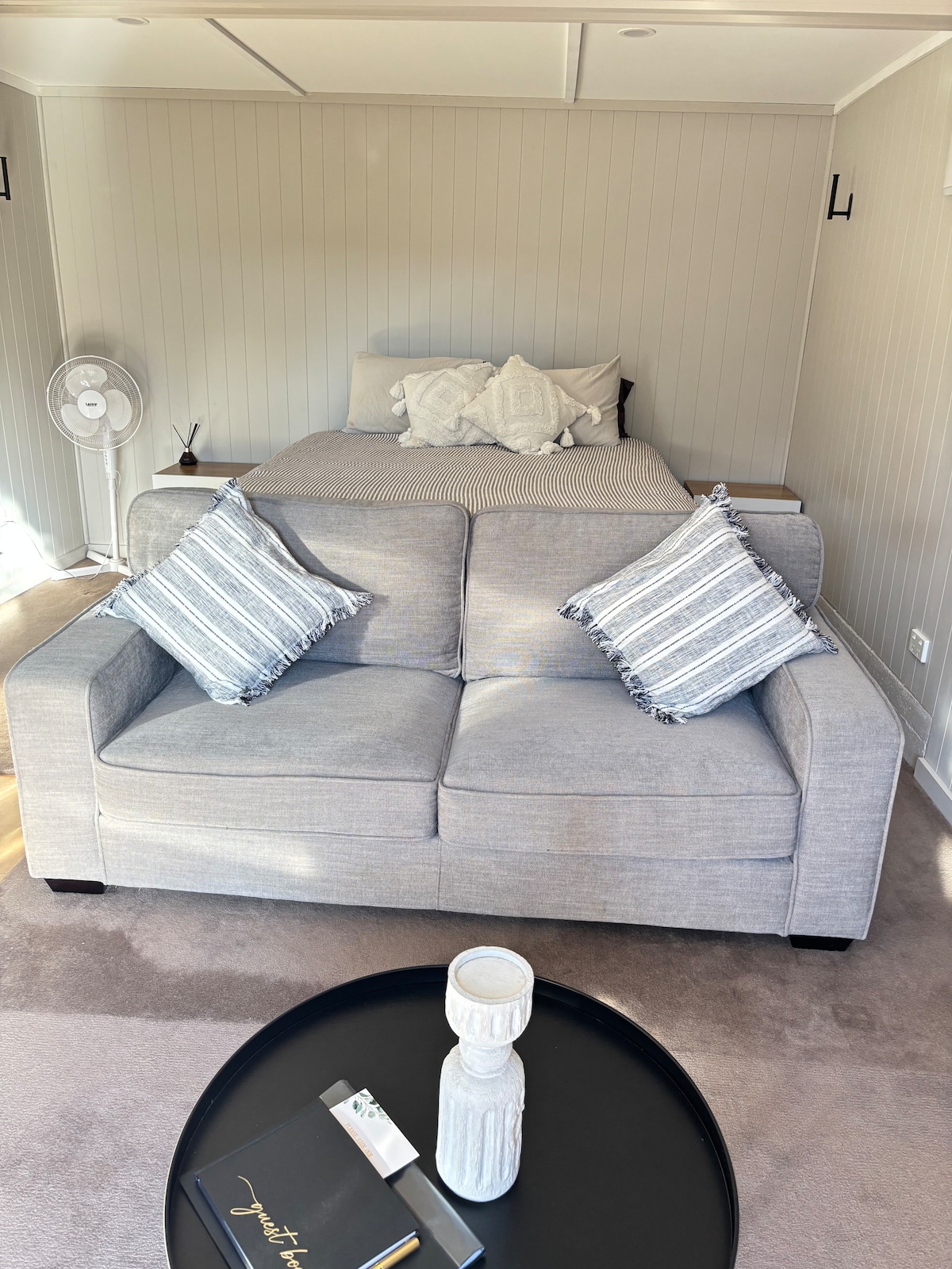 Tranquil self-contained 56m2 cottage in private woodland paradise, but minutes from the action. Nestled in our native bush gully and overlooking the spring-fed ponds, this is the perfect space to relax. Large queen bedroom, kitchenette, dining area and lounge with double sofa bed, plus portable single folding bed. Sheltered balcony with barbeque overlooking the garden and lakes. Lots of parking and secure storage available.