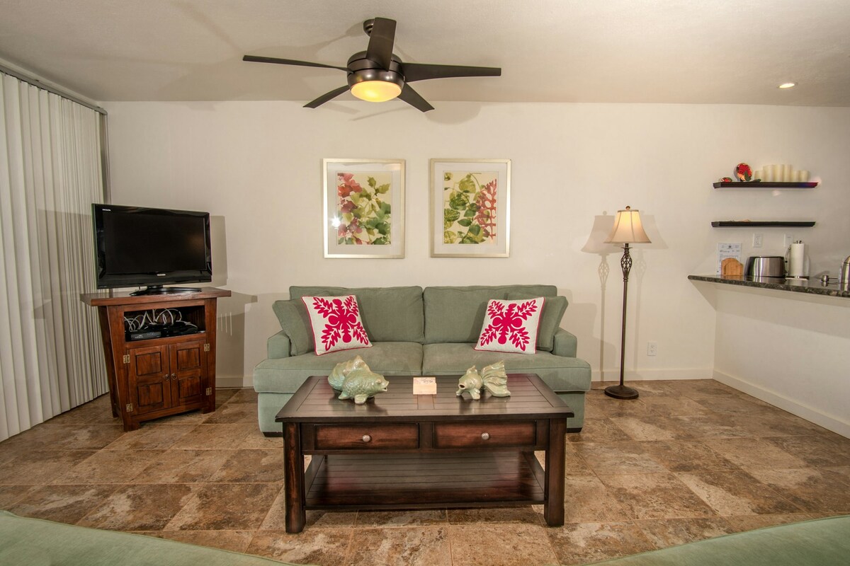 Hale Bali – Rental includes vehicle and taxes at no additional cost. Top floor corner unit at Kepuhi Beach Resort. Spacious studio with vaulted ceiling. Just steps to the beaches with West facing views of the ocean and beautiful sunsets from the furnished lanai. Close to the ocean side pool and convenience store. The unit was recently remodeled with all the amenities one would expect from a contemporary resort rental.
