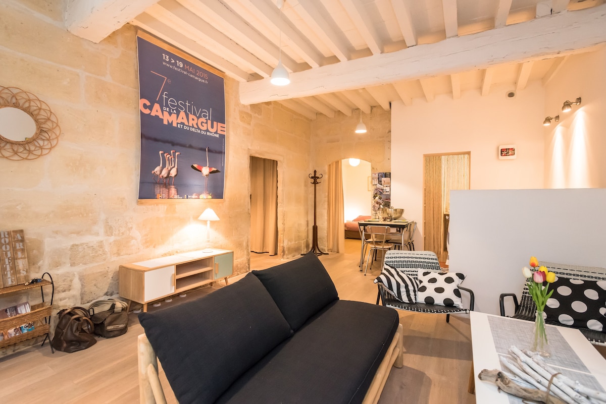美麗的50平方公尺閣樓,一層,根據保護區域翻新。位於羅克特區(Roquette district)的一條漂亮的步行街上,距離亞爾(Arles)市中心和羅納河(Rhône)畔僅2步之遙,您可以在那裡散步、慢跑或遛狗。 您可以沉浸在街區生活中,參觀阿爾勒及其寶藏。 「BOUCHES DU RHONE TOURISME」評為 3 星級的住宿 歡迎來寵物。
