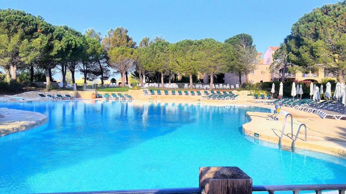 迷人的 32 平方公尺 T2,可容納 4 人,位於 Pont-Royal 高爾夫球場,有空調,經過翻新,由一個美麗的涼廊組成,可欣賞高爾夫球場的美景,一個設備齊全的廚房,開放式客廳,配有 2 張沙發床、一臺電視、一間帶淋浴間的浴室、浴缸、一個獨立的廁所、一間獨立的臥室,配有一張雙人床、一臺電視。 租金包括:WiFi、床單、浴巾、7 月和 8 月的泳池門票。4 月至 6 月底,泳池門票需額外付費。