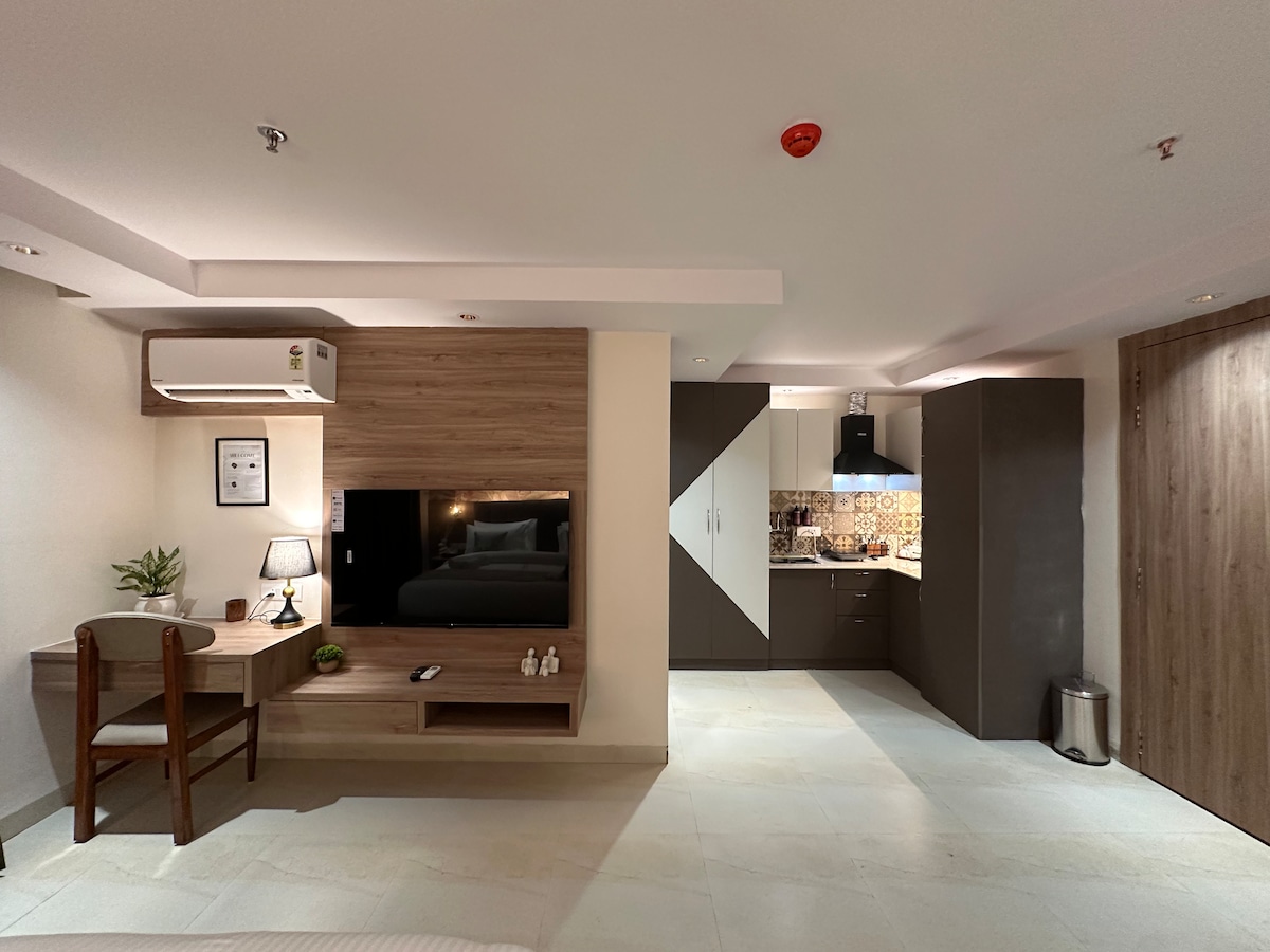 這間獨特的房源風格獨到。套房的美麗建築和設計將為您提供您應得的奢華。步行即可抵達Vvip Style Mall ,那裡有PVR電影院和許多其他餐廳。Swiggy、Blinkit、Zepto 和 Zomato 都可以在這裡使用。50 吋電視,可觀看 Netflix 和放鬆。廚房提供電磁爐和水壺電子電器。從陽臺欣賞美麗的景色。