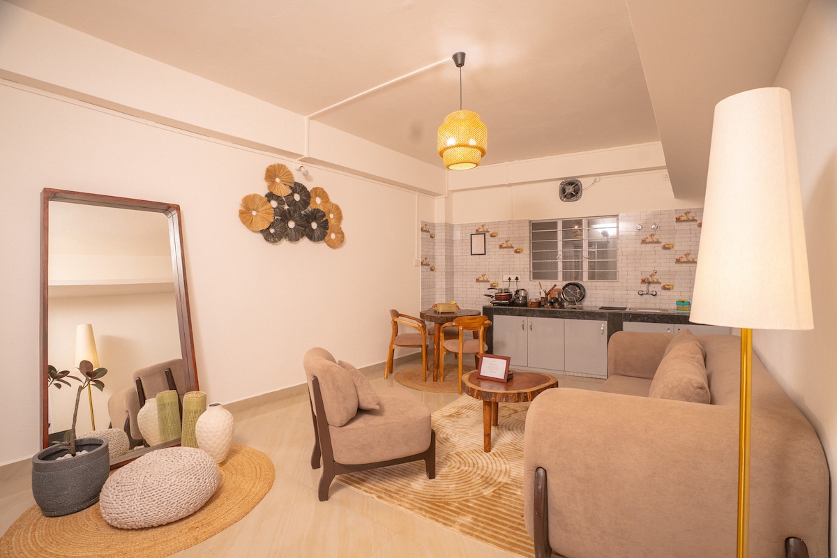 Step into a warm and thoughtfully designed 2BHK retreat in Shillong, styled with soft earthy tones, handcrafted wooden furniture and cozy boho accents. The apartment offers a spacious living room, serene bedrooms with hotel-style bedding and a charming dining nook with a live-edge wooden table. Soft lighting, curated décor and peaceful surroundings make this the perfect space to relax, unwind and feel completely at home. Perfect for couples, families or anyone seeking a peaceful mountain escape.