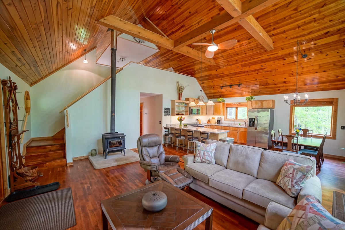 坐落在安靜的山頂上,您將在此寬敞而獨特的鄉村小屋中享受360 °的隱私! 主樓層設有設備齊全的廚房、配有DVD播放機和復古遊戲系統的客廳、用餐空間、全套浴室和2間臥室,每間臥室均配有一張雙人床和雙人床。 地下室樓下有另一間客廳、帶套房浴室的主臥室和健身房。 非常適合家庭、朋友團體、獵人等入住!