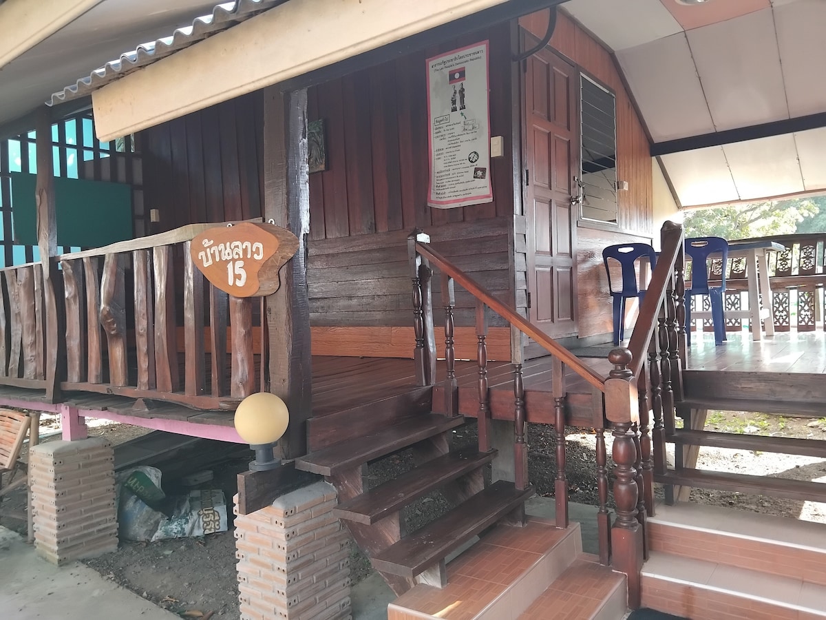 老式高跷屋,配備現代化設備。三間臥室、1間全套房浴室和1間獨立廁所。 戶外廚房和泳池與房東共用。 房源靠近附近的新鮮市場,房客可以購買新鮮的當地美食,或在老撾當地美食餐廳用餐。 房源距離市中心8.5公里,位於住宅郊區。 房客前往市中心的旅程是透過打車應用程式。