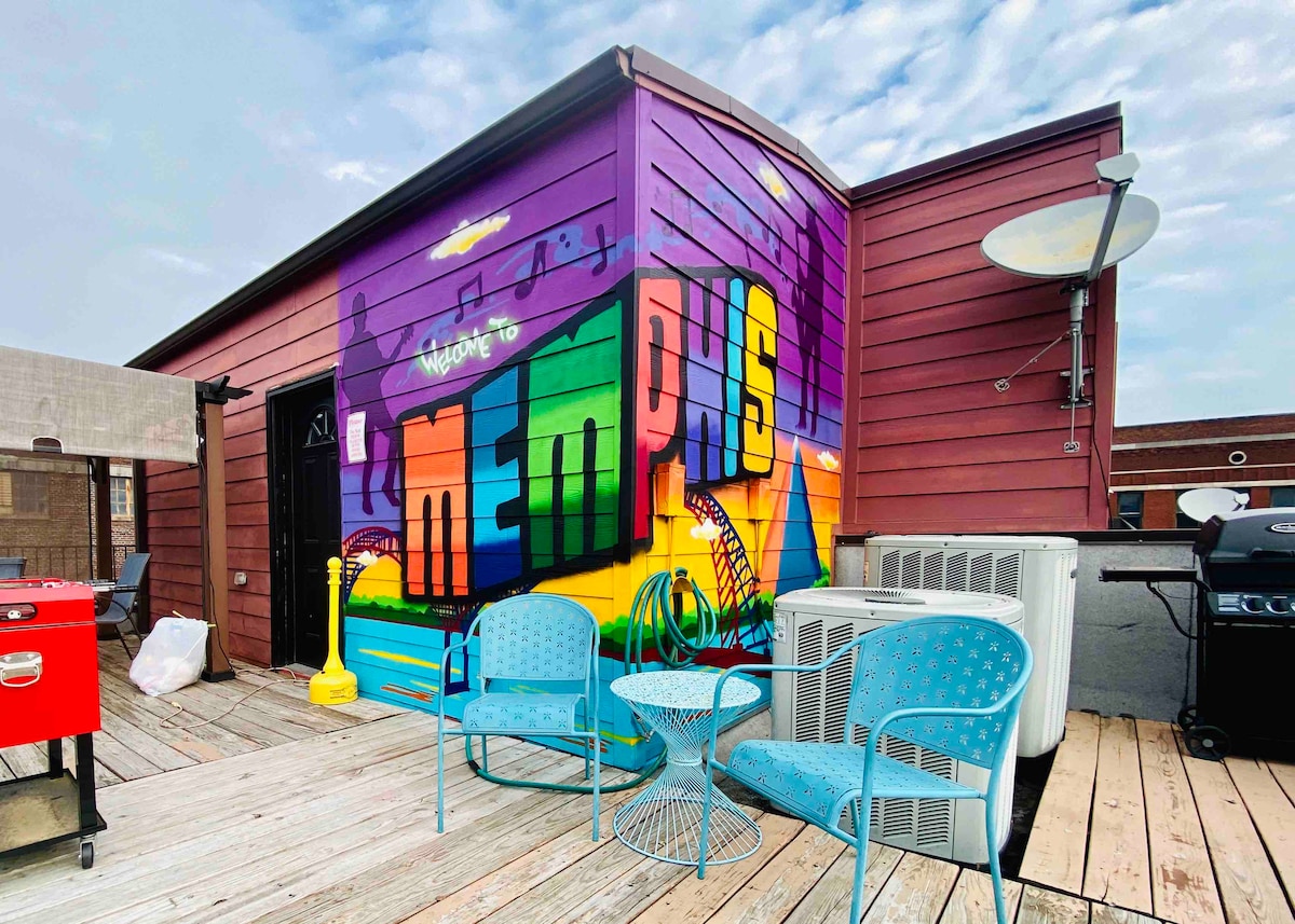 位置、位置、位置! 歡迎來到我們位於孟菲斯市中心的私人住宅,有兩個車庫!它就在主要街道上,非常適合步行。此房源有四層樓。地面層是車庫。二樓是客廳和廚房,配有半間浴室。第三層是臥室,第四層是屋頂。 絕對禁止舉辦派對!我們將不得不取消或拒絕您的預訂!