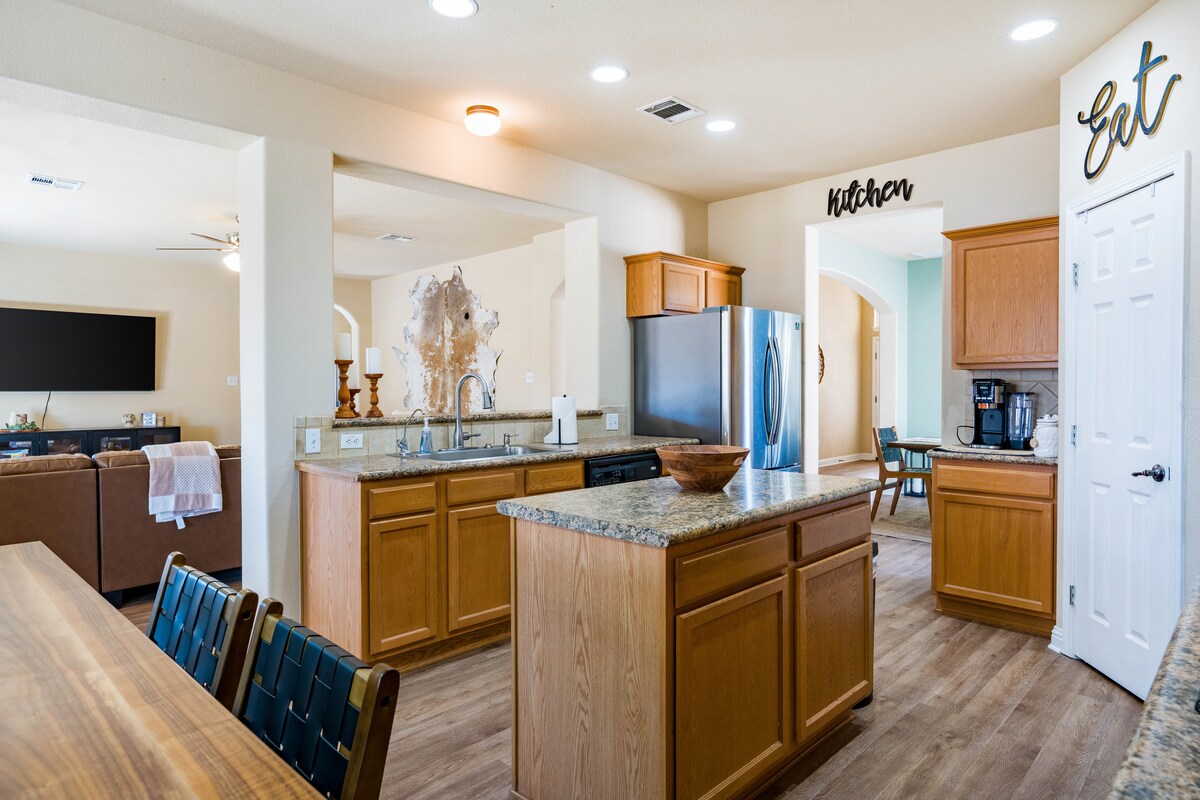 歡迎來到這個精美翻新、令人放鬆的家外之家,德州中部開放式度假勝地。您可以隨意使用設備齊全的廚房,供家庭用餐和烘焙。 戶外空間非常適合在樹木林立的後院的陰涼露臺上烤肉和放鬆。提供各種戶外遊戲。兩間臥室有雙人床,另一間有2張單人床,一張Ashley Furniture沙發床,配有雙人記憶泡綿床墊。 主套房設有專屬工作空間。
