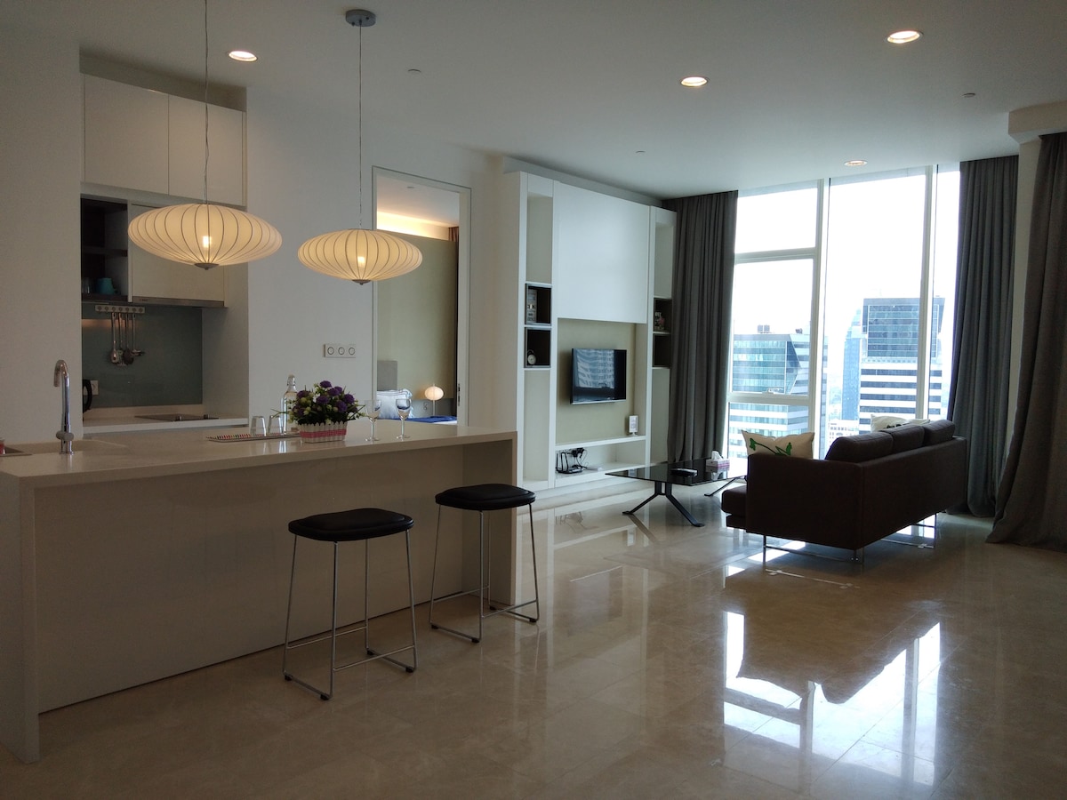 超級加大雙人牀公寓,配有客廳、廚房和帶浴缸的獨立衛浴。 公寓步行5分鐘即可抵達雙峰塔(KLCC)。 超級加大雙人牀,寬200公分,長200公分,最多可入住2位成人。 不適合兒童或嬰幼兒入住。 300 Mbps光纖網路。 客廳和臥室均配有優質Netflix。 房客也可以使用洗衣機和烘衣機。 地下室有收費停車位。 可輕鬆烹飪。