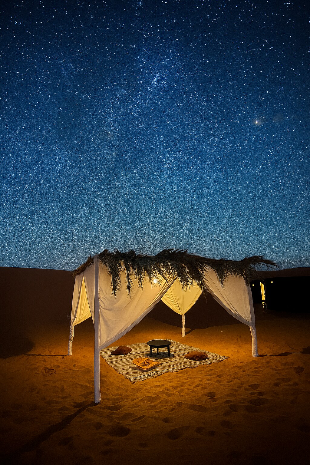 我們熱烈歡迎您來到我們的家庭和家園,與您分享撒哈拉的美麗和壯麗,並沉浸在遊牧生活的節奏中。 在撒哈拉獨特的體驗值得一個獨特的住宿。 Indigo Luxury Camp是一個小型私人營地,位於Merzouga沙丘,提供真實性和舒適性。 這個豪華營地由撒哈拉原住民擁有和管理。