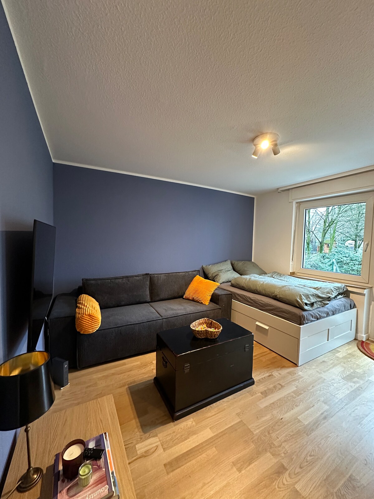 安靜、非常明亮的 1 間臥室公寓,擁有自己的屋頂露臺,最近在杜塞爾多夫市附近的時尚區域翻新。位於二樓,可俯瞰寧靜的大後院。舒適的彈簧床、電動遮光百葉窗和空調(可調節)確保您能安穩入睡。獨立浴室從走廊延伸,並提供隱私。步行即可抵達至少 50 家餐廳,前往市區或展覽會(Messe)的交通非常便利(搭乘巴士 24 分鐘)。