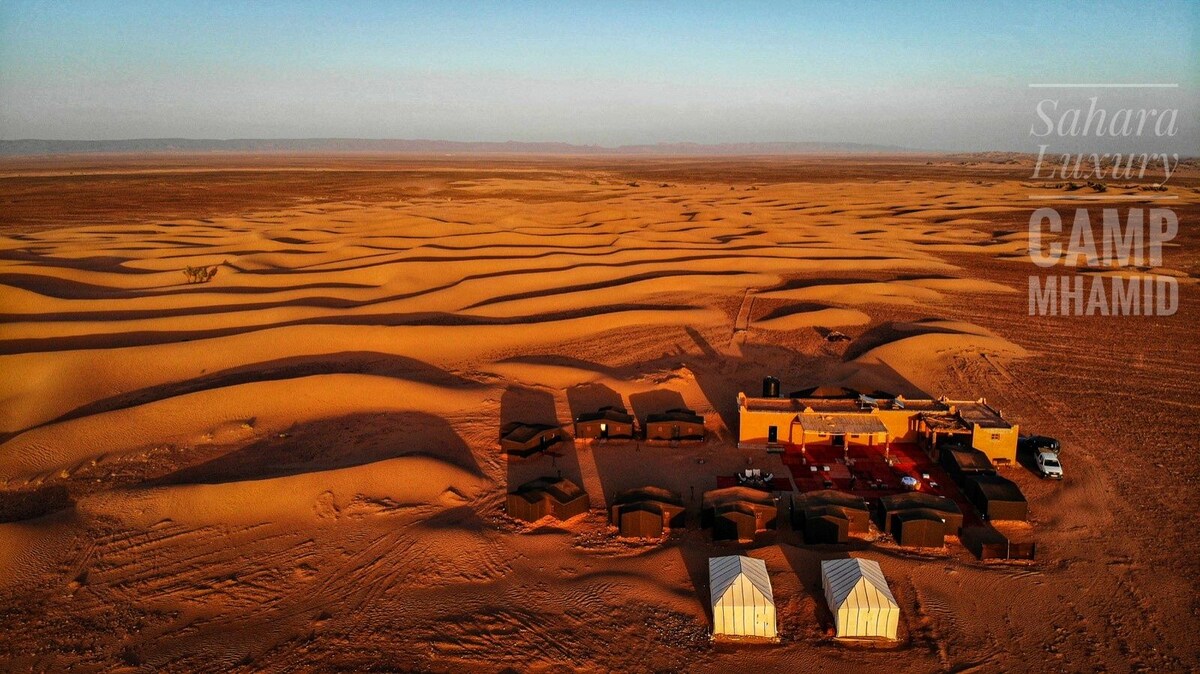 我們的營地是沙漠中的一片綠洲,距離Mhamid鎮7公里-提供從鎮上到營地的交通。 坐落在柔軟的金色鄧恩斯門口,在寧靜的沙漠景觀中,您可以在樹蔭下與大自然重新建立聯繫,放鬆身心。 6個遊牧帳篷(如果您想要團體預訂,請發送諮詢) 傳統淋浴 神奇美食-含早餐。 如有需要,可提供晚餐,只需支付少量額外費用。