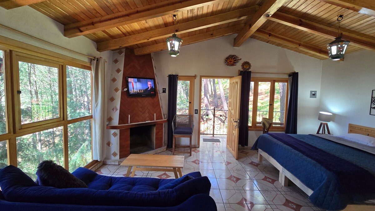 小木屋位於森林中,景色優美,是情侶的理想選擇。 設施包括: -陽台。 .- 烤肉架。 - 配備齊全的廚房。 .- 全套浴室 .- 1 張特大床 .- 1 張沙發床 .- 壁爐 .- 網路 - 距離馬薩米特拉市中心 15 分鐘 露臺設有休息區,景觀優美。