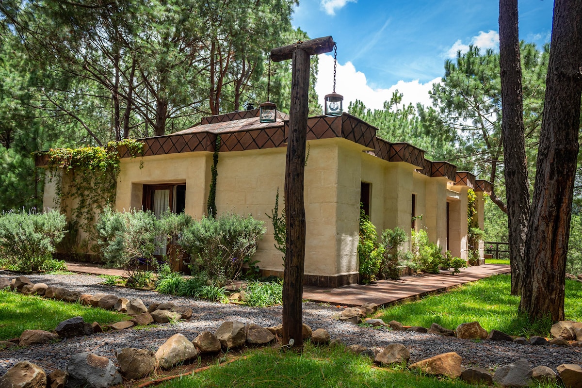 小木屋非常適合情侶入住,景觀優美,位於森林中。它有: - 陽台。 .- 烤肉架。 - 配備齊全的廚房。 - 全套浴室 .- 1 張 KS 床 .- 1 張沙發床 .- 壁爐 - 距離馬薩米特拉市中心 15 分鐘 露臺設有休息區,景觀優美。
