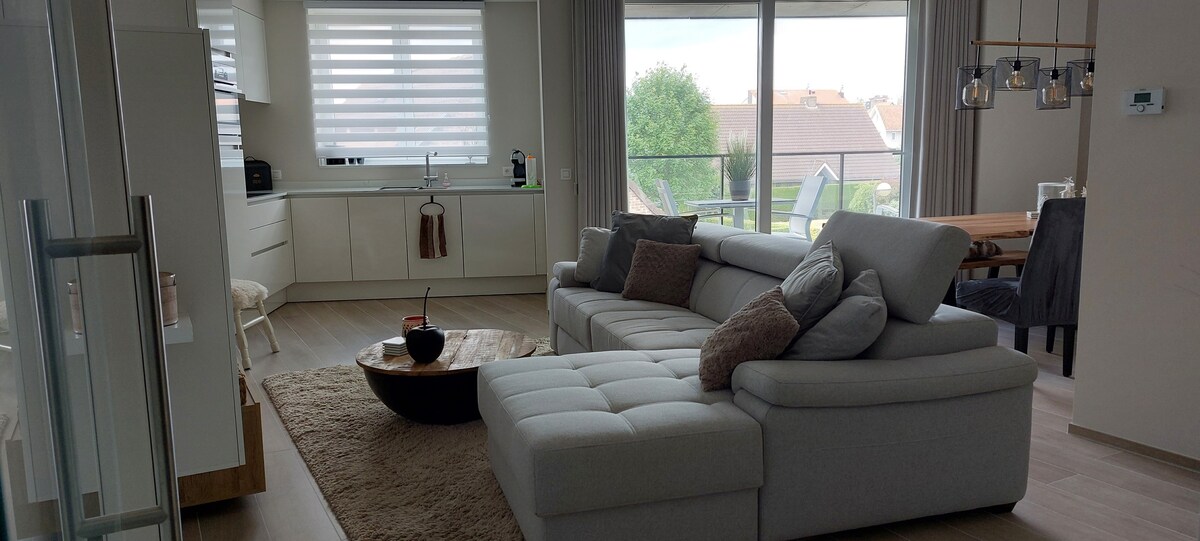 明亮的公寓,可欣賞全景海景和沙丘景觀。 用餐區域可以變成有遮蔭的露臺,您可以在這裡欣賞日落。 公寓設有開放式、設備齊全的廚房,配有洗碗機。 -2間配備標準雙人牀的臥室 -帶浴缸和馬桶的浴室+帶洗手台的淋浴間+走廊的馬桶 車庫:最大高度1.85米 位於奧尼爾海灘俱樂部和碼頭之間(安靜的海堤) 海岸電車約 布魯日,搭火車/開車 15 分鐘