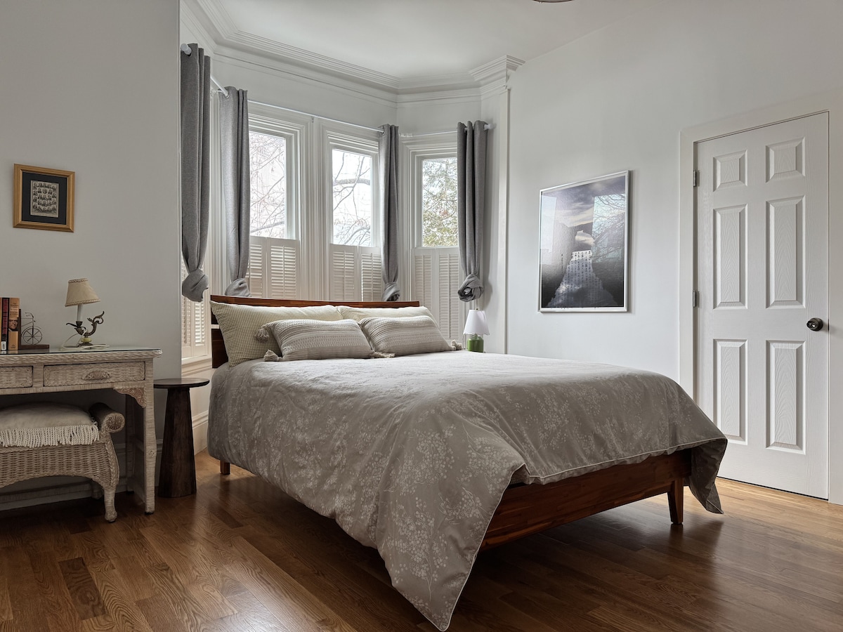 一座美麗、全面翻新的歷史紅磚房,配有俯瞰城市的私人屋頂露台。這間充滿色彩和浪漫的藝術家工作室,充滿書籍、唱片、藝術品和所有舒適的家居用品,坐落在一個安靜的社區,景觀迷人。步行即可抵達公共交通工具、世界一流的大學、醫療機構和博物館。步行約22分鐘即可抵達芬威球場、MGM音樂廳和其他景點!