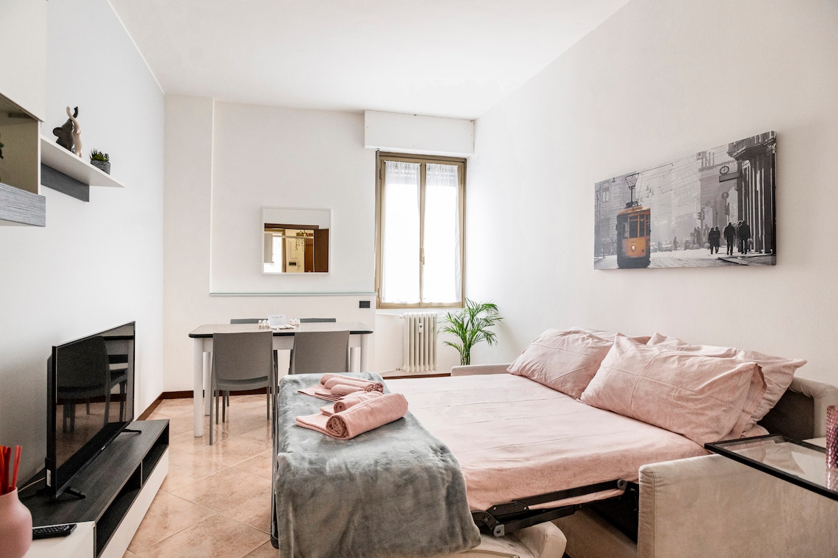 在典型的舊米蘭式陽台房屋中,有一間舒適、明亮且非常安靜的兩居室。步行五分鐘即可抵達地鐵站,靠近普拉達基金會和幾家餐廳和酒吧。公寓布局良好:客廳配有用餐區、工作空間和舒適的沙發床;臥室配有雙人床和辦公桌。令人愉悅的戶外空間,讓您放鬆身心,享受天空和屋頂的寧靜。非常快速的 WiFi:420 mbps