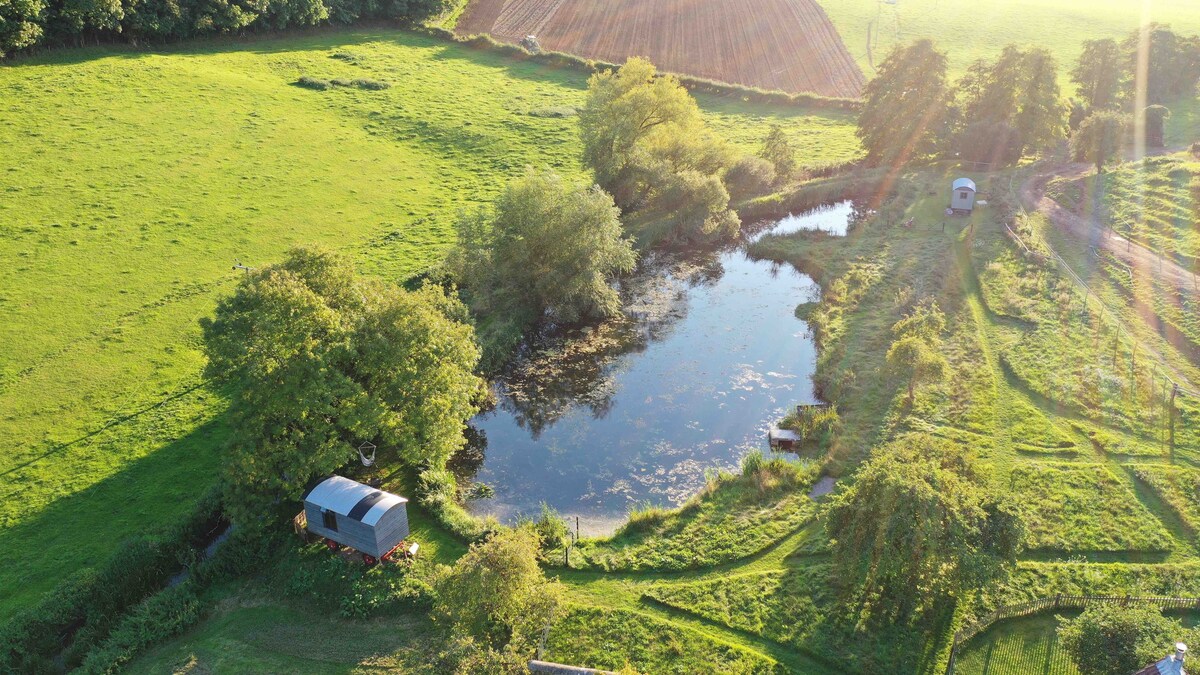 Welcome to Bill's! A peaceful, secluded shepherds hut on the bank of a small lake, set in the rolling hills of our organic dairy farm. Bill's all booked up? Check out our other shepherd's huts, Edgar's and Tom's! Also avaliable to book all together for a group of up to 7 people.