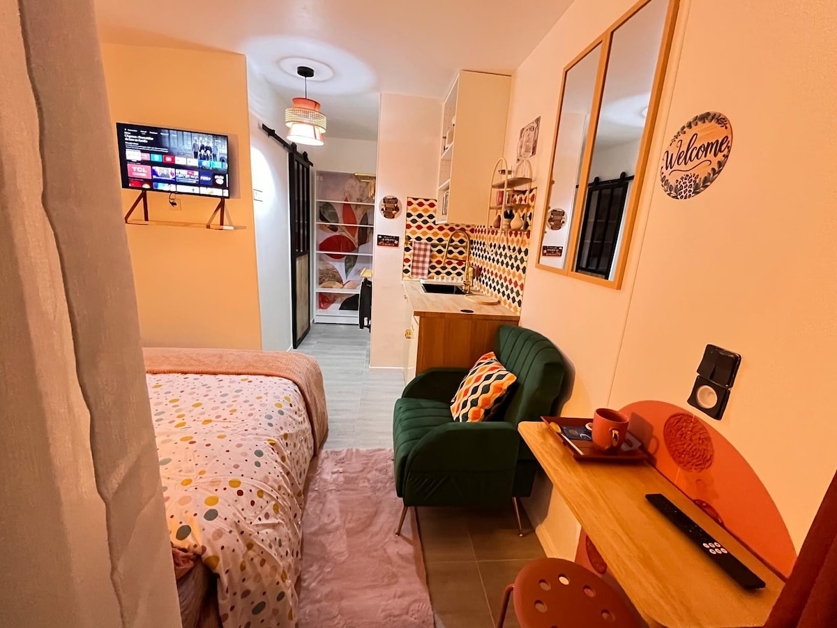 Niché au cœur du vieux Milly-la-Forêt et à quelques battements d'ailes de la forêt de Fontainebleau, venez profiter du cadre raffiné et du confort du Carpe diem. Ce gîte classé 3 épis dispose d'un accès indépendant, d'un patio privatif et de la chaleur d'un poêle à granulés. Ce studio vous offre salon-cuisine sous une belle hauteur sous plafond. Par une véritable échelle de meunier vous accédez à l'espace nuit en sous pente. Un lit queen size à mémoire de forme vous offrira un confort absolu.